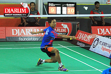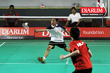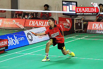 Nijynsco Kaleb (Candra Wijaya) mengembalikan shuttlecock ke arah Daniel Ari Wibisono (Sarwendah)