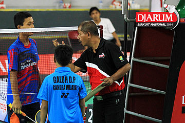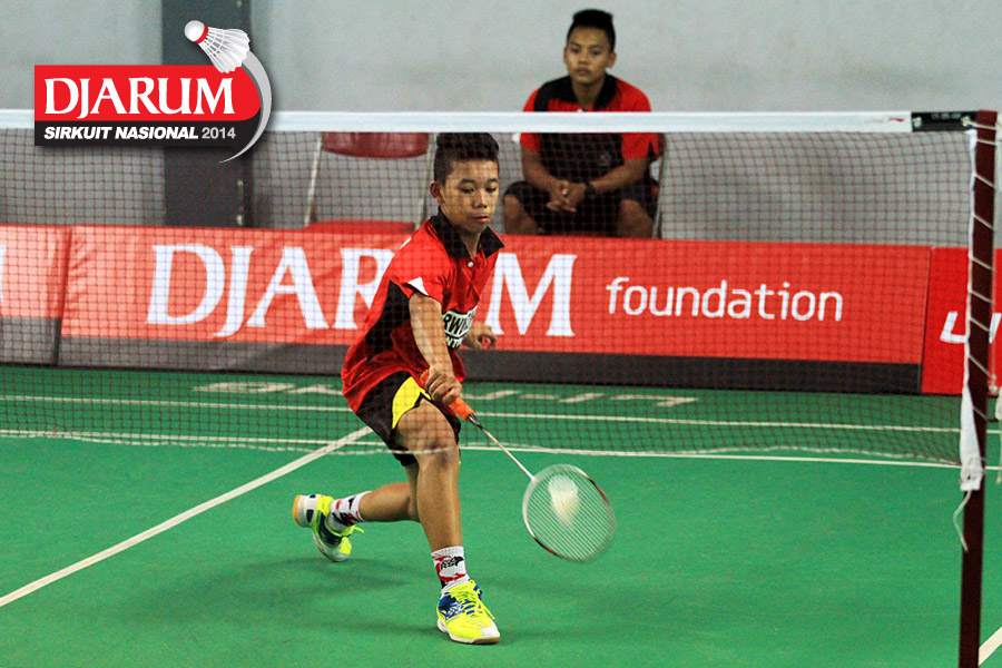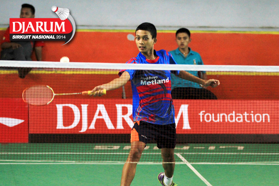Armas Nafinium (Jaya Raya Metland) mengembalikan shuttlecock ke arah Galuh Dwi Putra (Candra Wijaya)