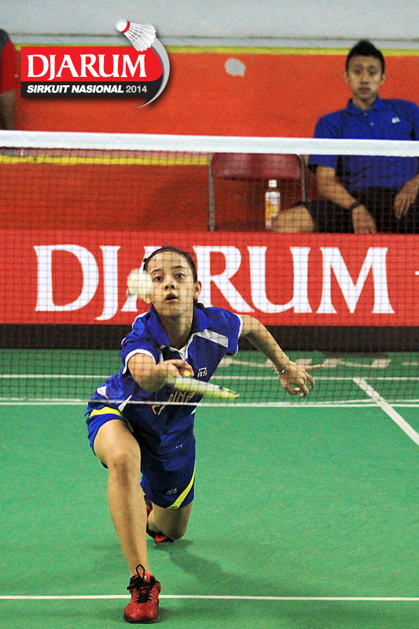 Inas Hasnaya (Mutiara) berhasil mengembalikan shuttlecock ke arah Livia Vidyawen (Candra Wijaya)