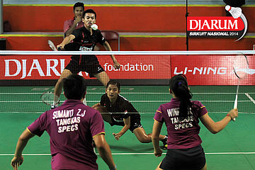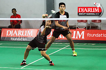Andika Ramadiansyah/Rahmadhani Hatiyanti (Djarum Kudus) mengembalikan shuttlecock ke arah Zachariah Joshiano/Winny Oktavina (Tangkas)