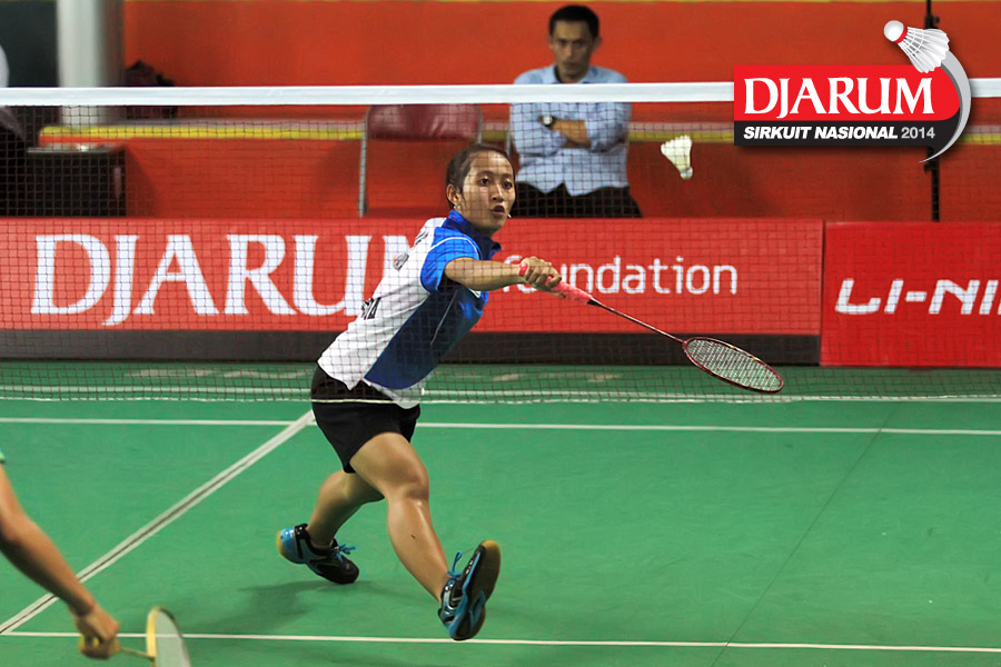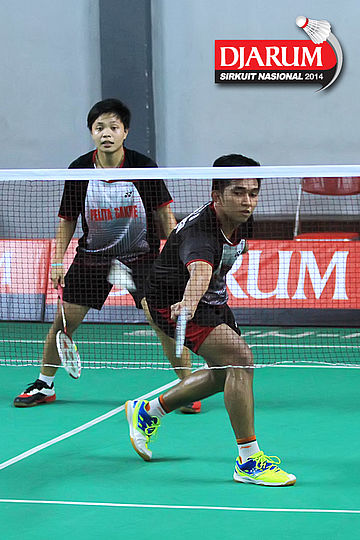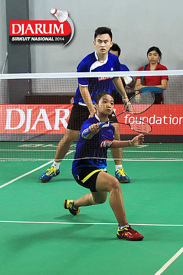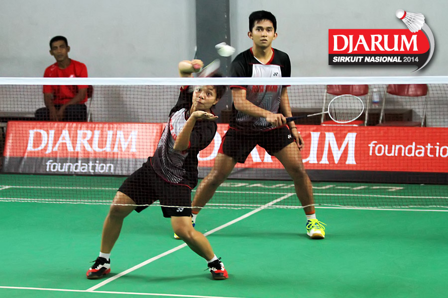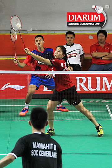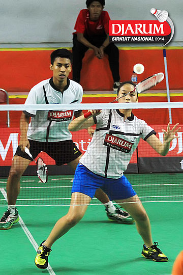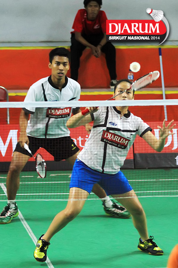 Afiat Yuris/Anneke Feinya (Djarum Kudus/Jaya Raya) berhasil menghadang serangan yang dilepaskan Christofel Karinda/Jessika Pertiwi (Mentari V-Kool)