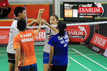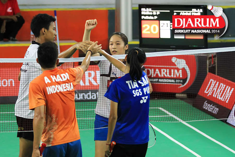 Ridho Bianto/Felicia Parmenas (Djarum Kudus) dan Abdul Hadi/Tia Sari (Aufa/SGS PLN) saling bersalaman usai bertanding