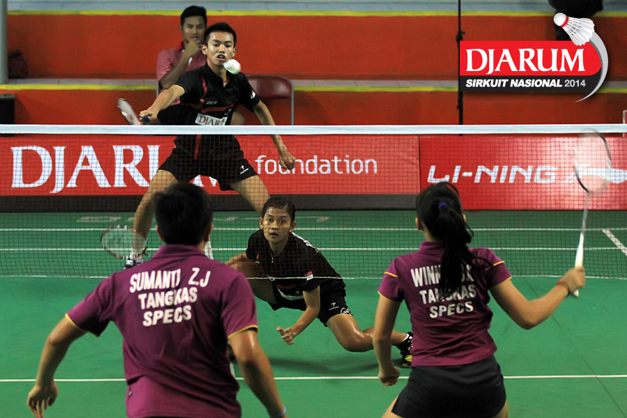 Tedi Supriadi/Mychelle Crhystine (Djarum Kudus) menghadang serangan yang dilepaskan Deni Mamahit/Fransisca Rahardja (Exist)