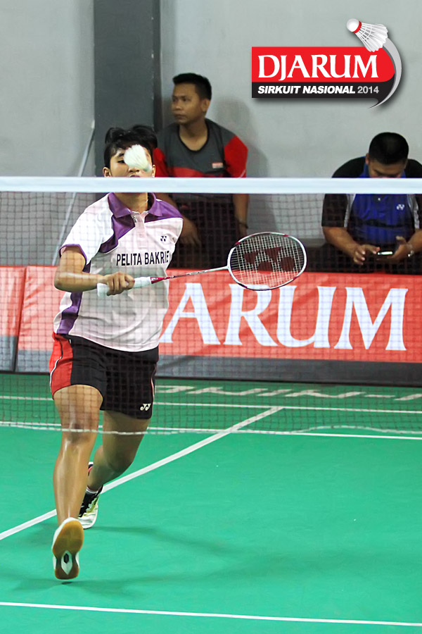 Jauza Fadhila (Pelatprov PBSI DKI Jakarta) bersiap menyambut pengembalian dari Jessika Pertiwi (Mentari V-Kool)