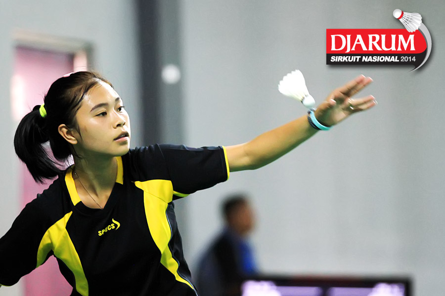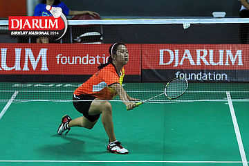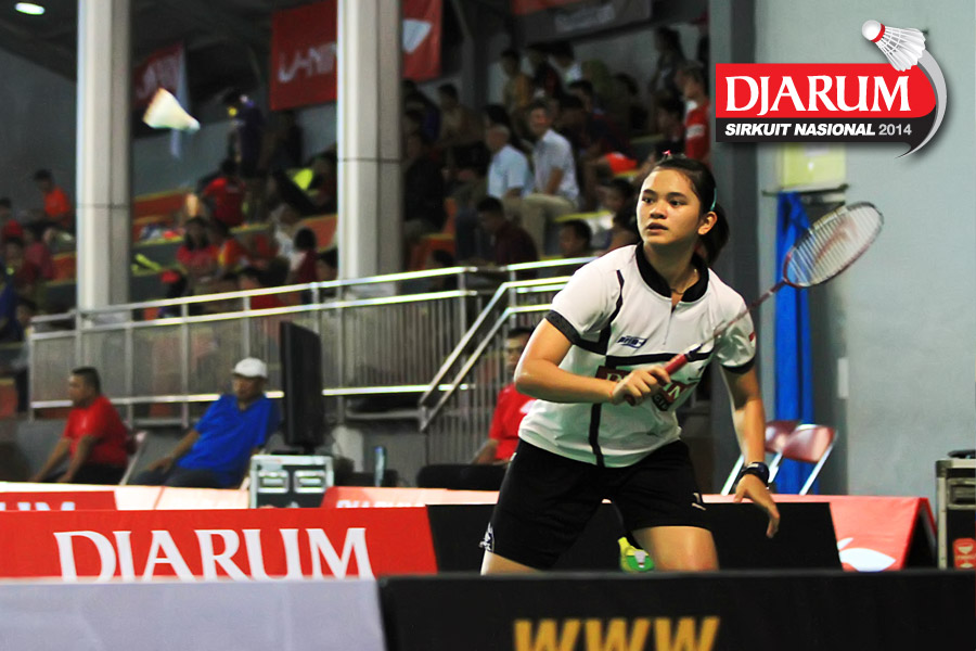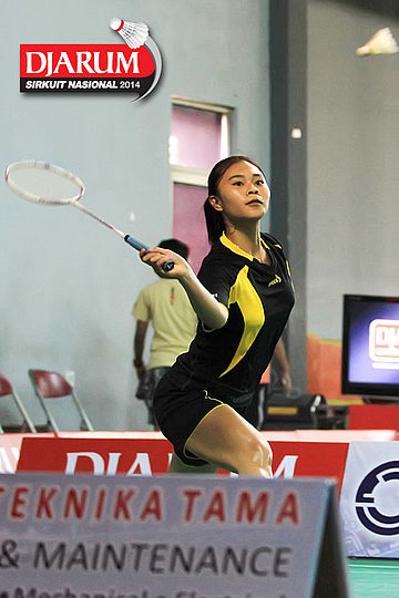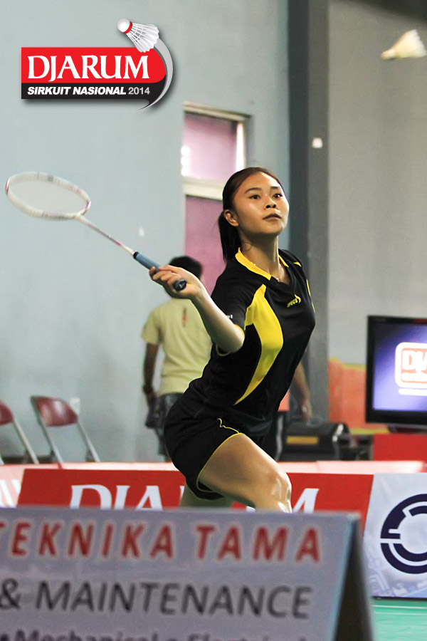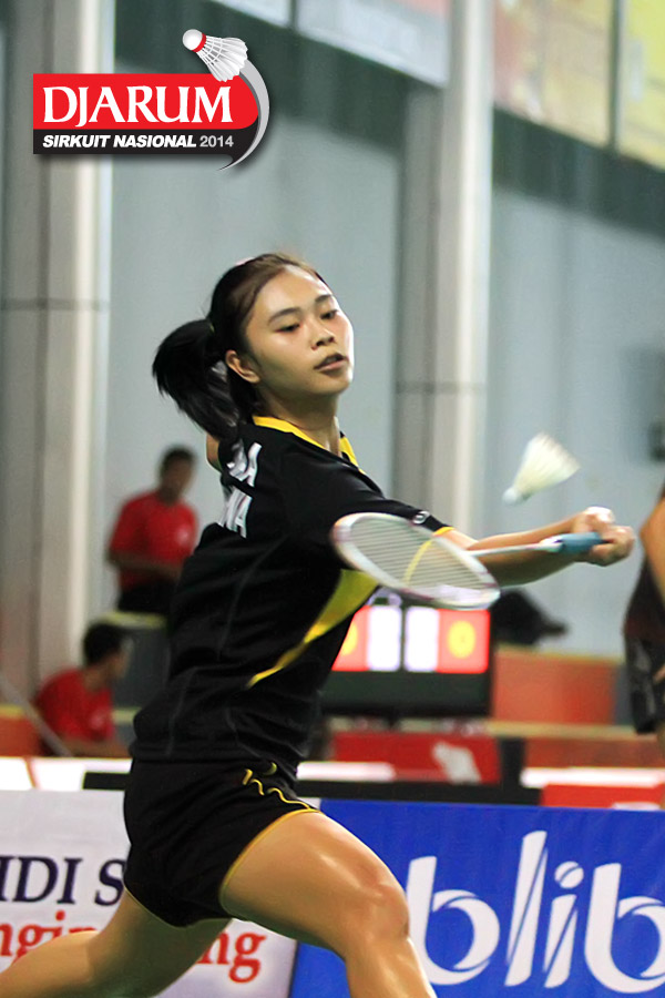 Fitria Anggraeni (Exist Sampurna) mengembalikan shuttlecock ke arah Ghaida Nurul (Djarum Kudus)