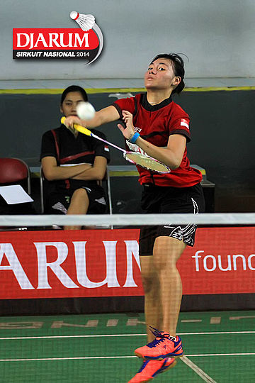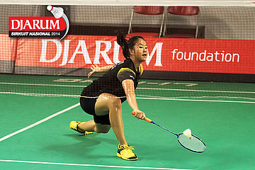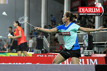 Yeni Asmarani (Djarum Kudus) mengembalikan shuttlecock ke arah Putri Sekartaji (Mutiara Cardinal)