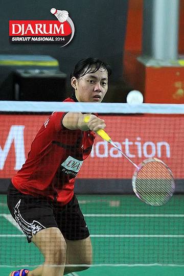 Alamsyah Yunus (JR Enkei) bersiap menyambar pengembalian dari Yoga Sidik (Pelatprov PBSI DKI Jakarta)