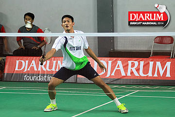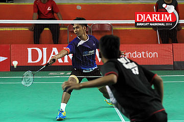 Alamsyah Yunus (JR Enkei) mengembalikan shuttlecock ke arah Yoga Sidik (Pelatprov PBSI DKI Jakarta)