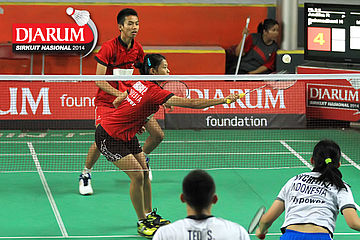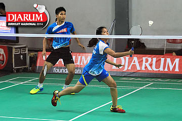 M. Aria Wijaya/Monica Nggilu (Mutiara Cardinal) berusaha menggapai pengembalian dari Jeka Wiratama/Marsheilla Gischa (Djarum Kudus)