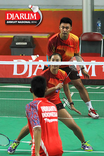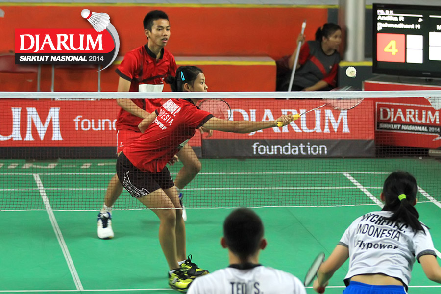 Andika Ramadiansyah/Ramadhani Hastiyanti (Djarum Kudus) mengembalikan shuttlecock ke arah Tedi Supriadi/Mychelle Crhystine (Djarum Kudus)