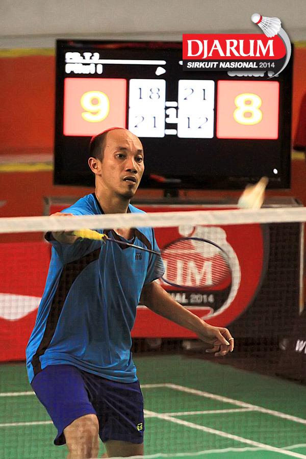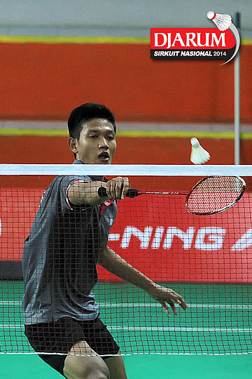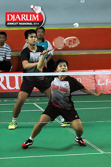 Panji Akbar (Pelatprov PBSI DKI Jakarta) mengembalikan shuttlecock ke arah Senatria Agus (SGS PLN)