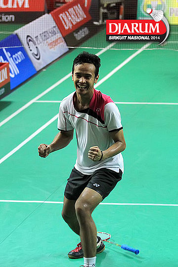 Selebrasi Senatria Agus (SGS PLN) saat berhasil mengalahkan Panji Akbar (Pelatprov PBSI DKI Jakarta)