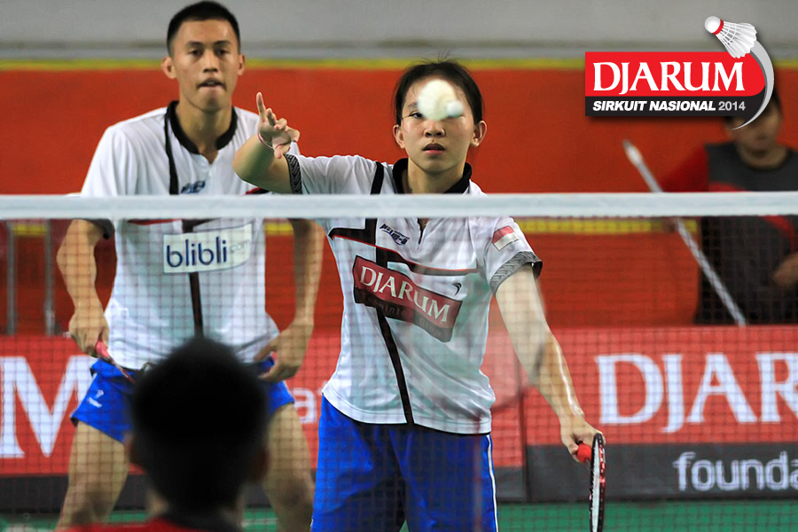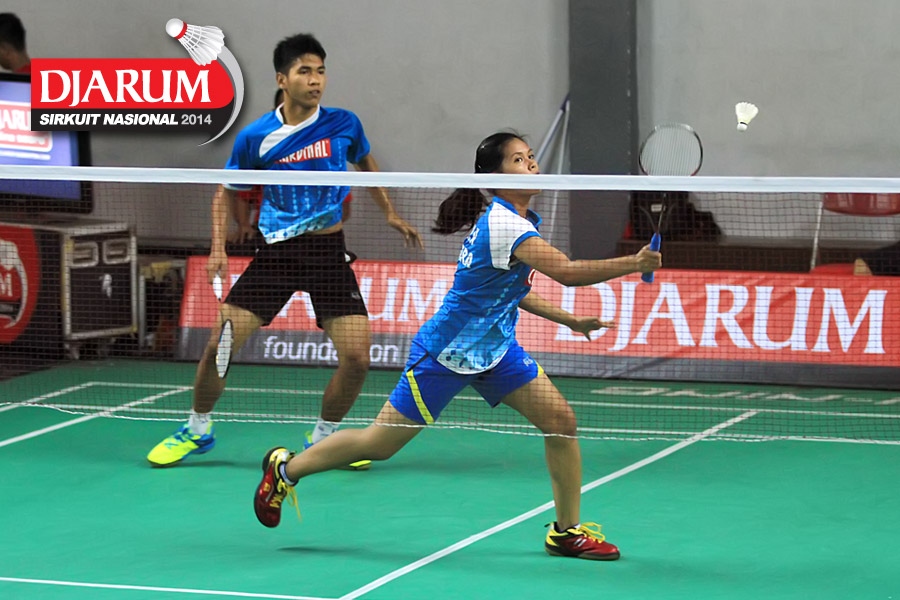 Jeka Wiratama/Marsheilla Gischa (Djarum Kudus) bersiap mengembalikan shuttlecock ke arah M. Aria Wijaya/Monica Nggilu (Mutiara Cardinal)