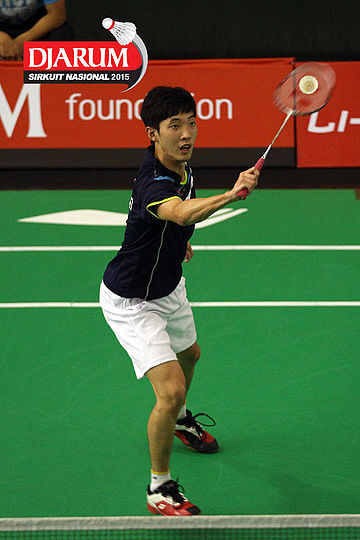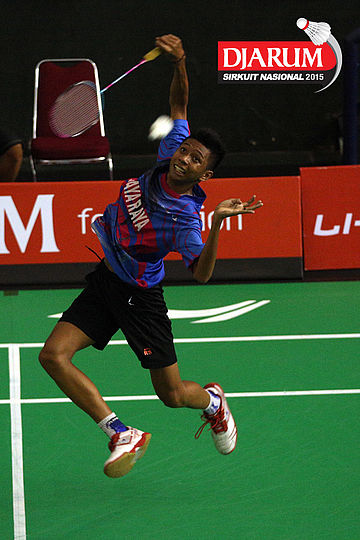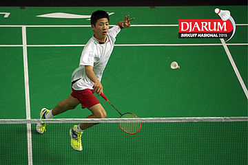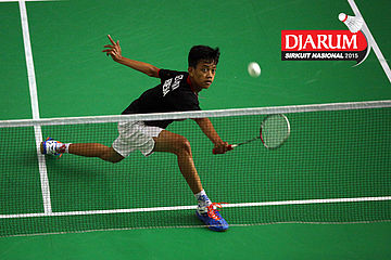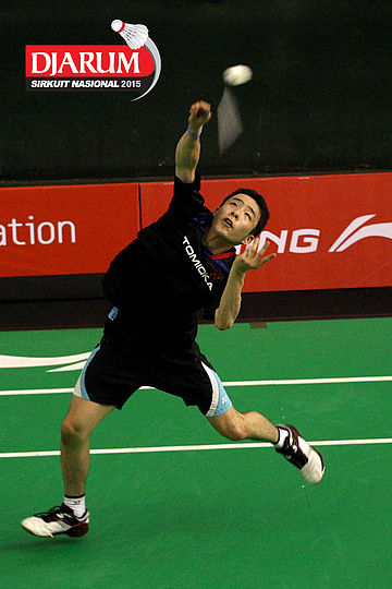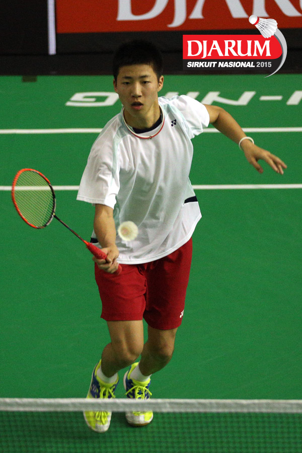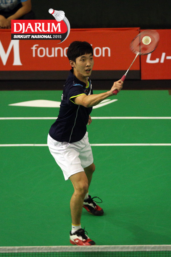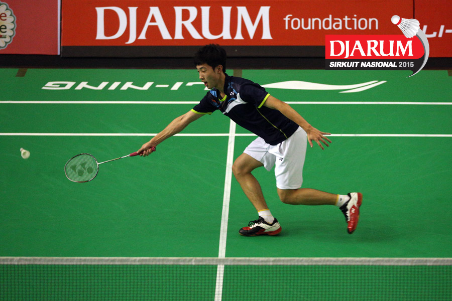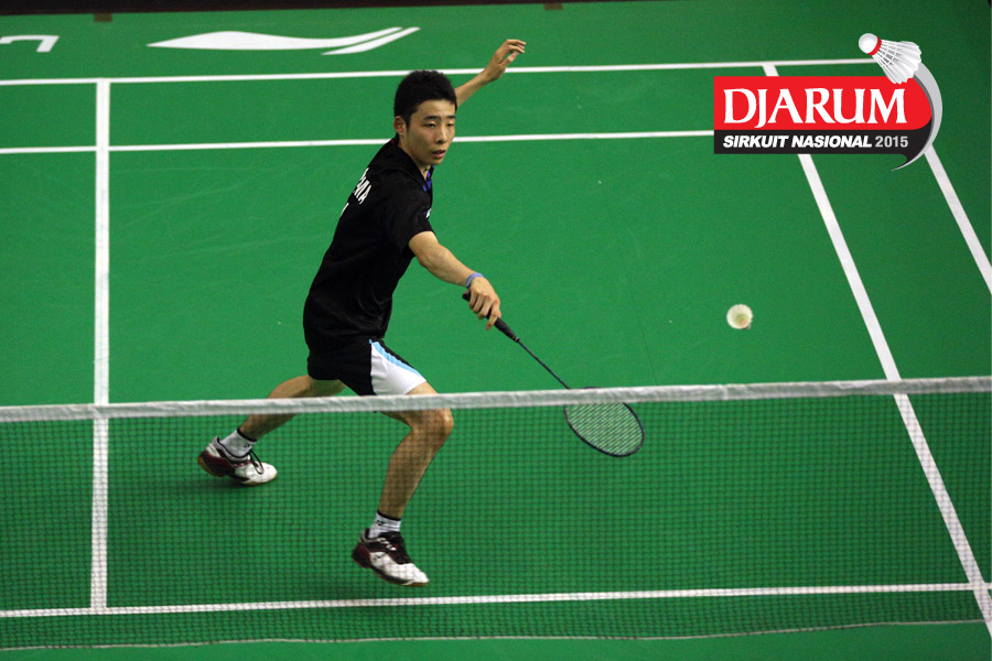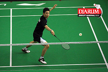 Tai Hsien (Taiwan) mengembalikan shuttlecock ke arah Akmal Farabi (Pelita Bakrie).