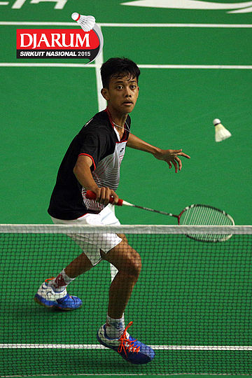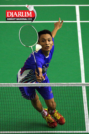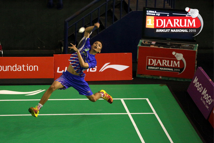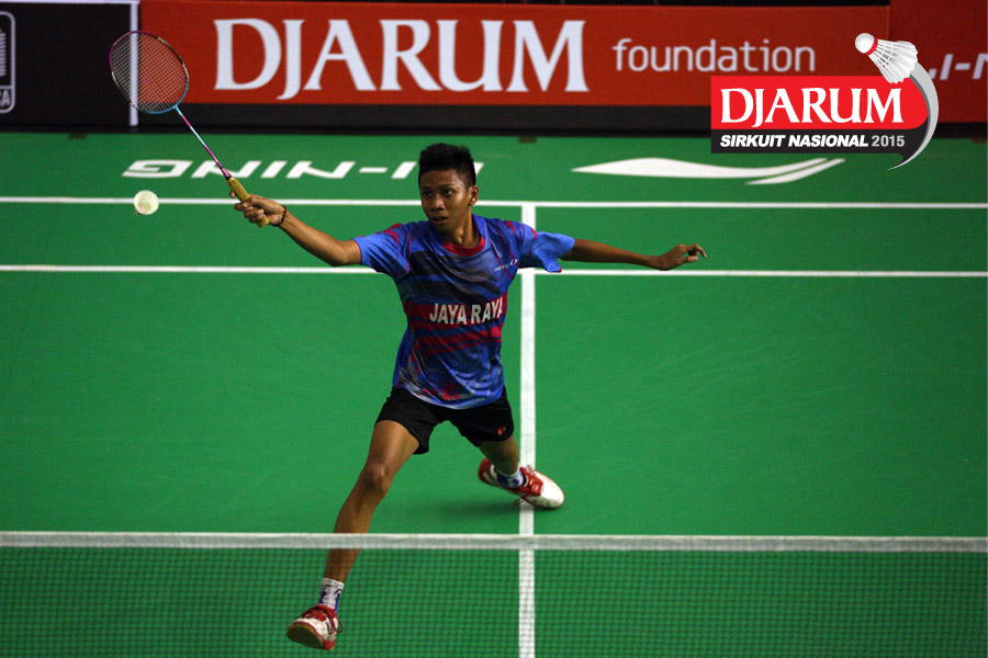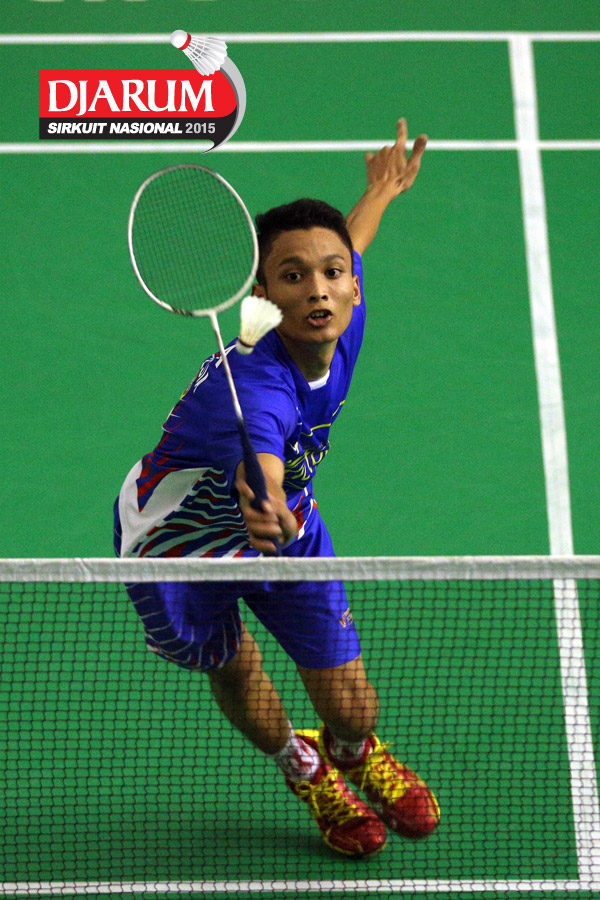 Rezi Saktiva (SGS PLN) mengembalikan shuttlecock ke arah Wahyu Ginanta (Jaya Raya).