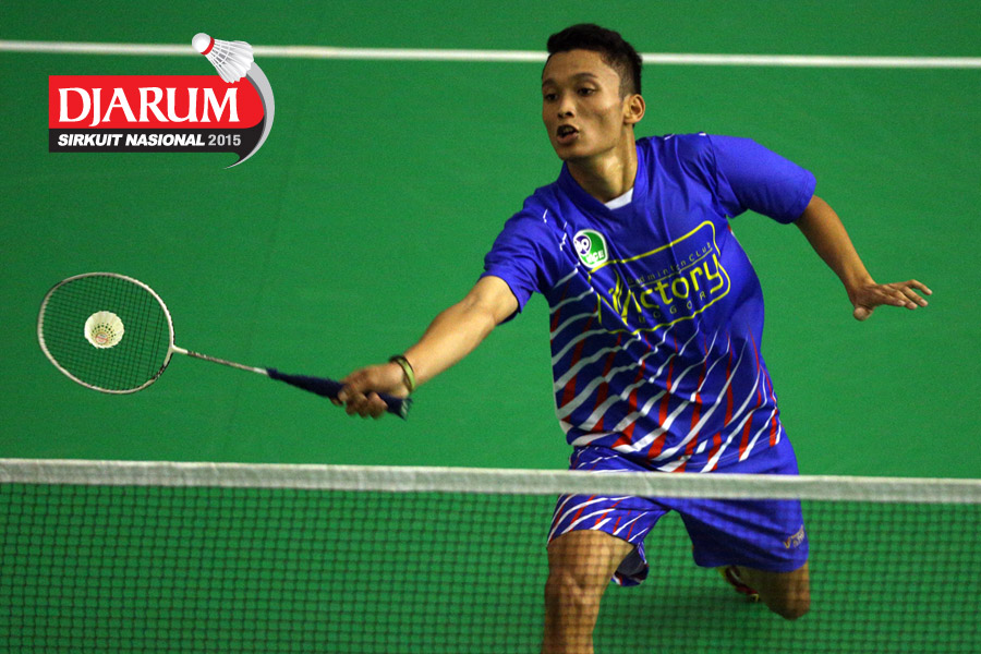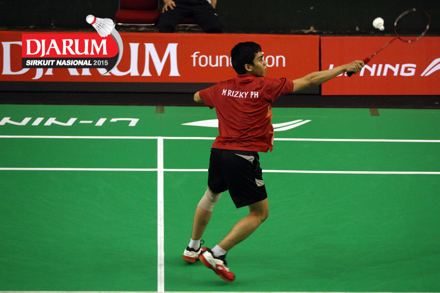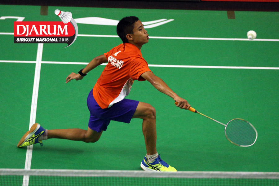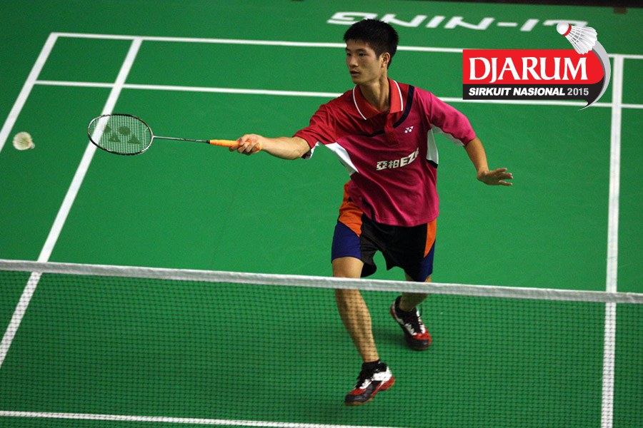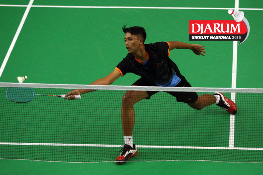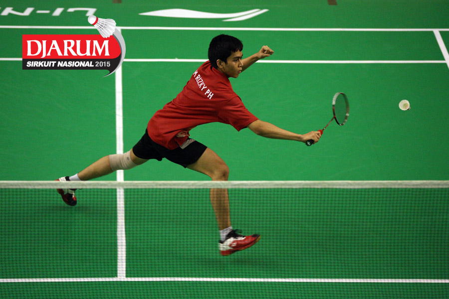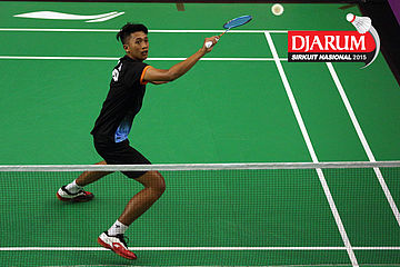 Hilmi Nasarullah (Pelita Bakrie) mengembalikan shuttlecock ke arah Faiz Bin Rozain (Terengganu Malaysia).