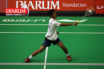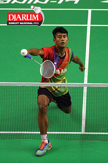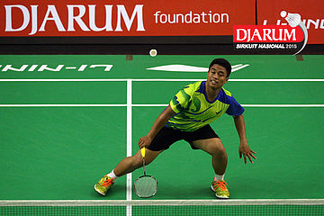 Akmal Farabi (Pelita Bakrie) mengembalikan shuttlecock ke arah Tai Hsien (Taiwan).