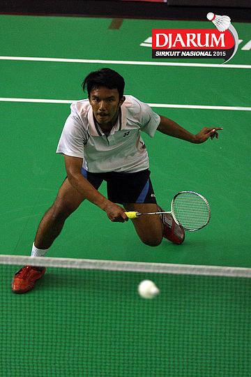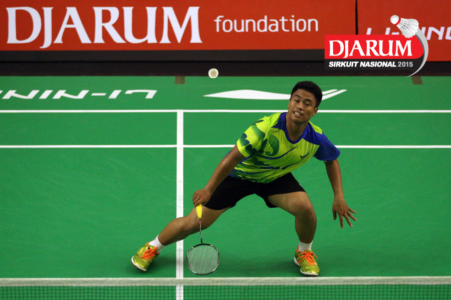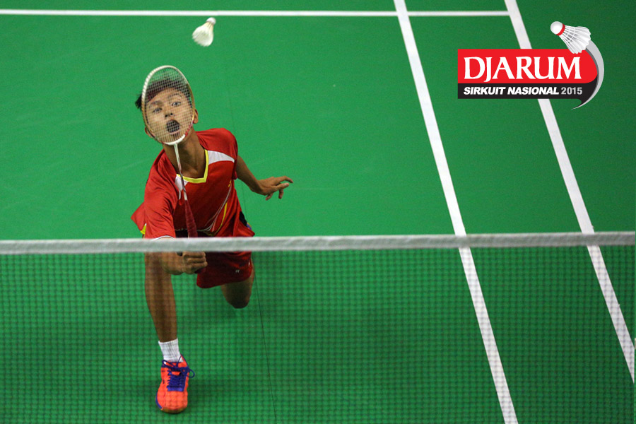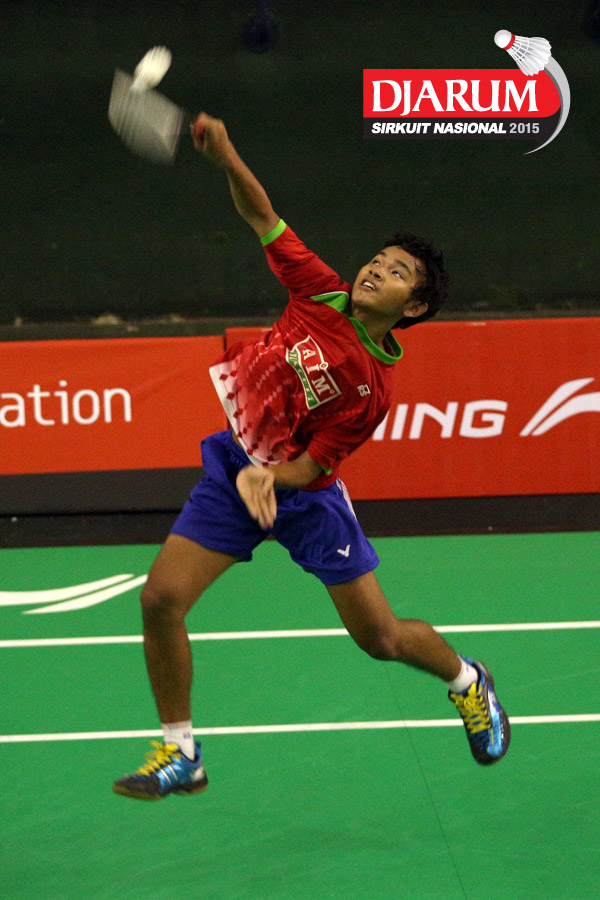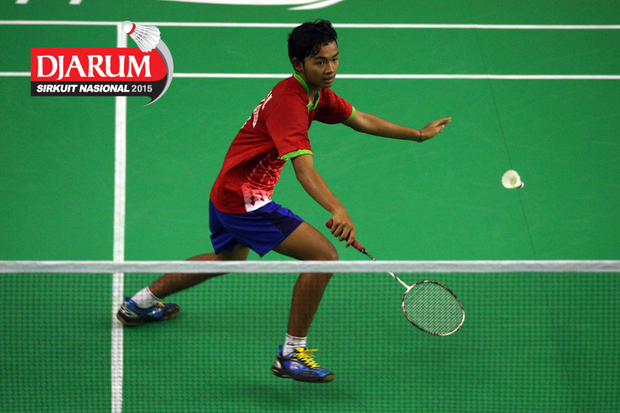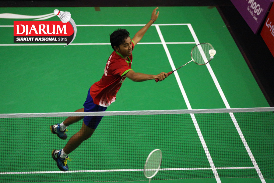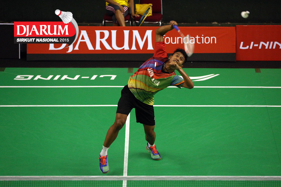 Andhika Ariyandi (Jaya Raya) mengembalikan shuttlecock ke arah Aldo Adam (Suryanaga Surabaya).