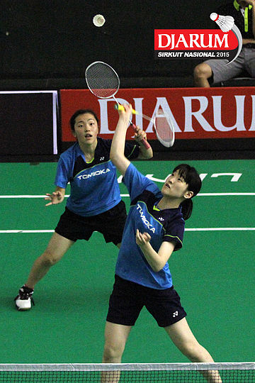 Asuka Takahashi/Makoto Saito (Tomioka Jepang) menyambar pengembalian tanggung dari Adrianna Ruth/Clara Celeste (Sarwendah).
