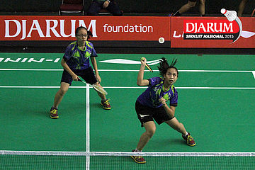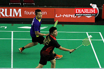 Aryanto Haryadi/Nathalia Poluakan (JR Enkei) mengembalikan shuttlecock ke arah Liu Wei Chen/Wen Hou Yun (Taiwan).