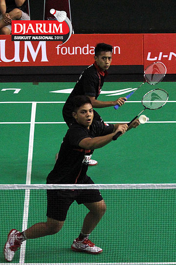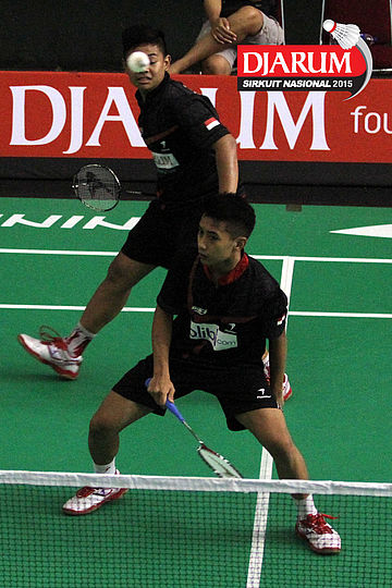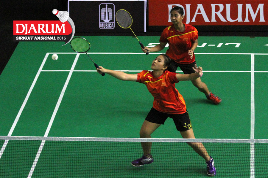 Genta Gusti/Rexky Afdillah (Djarum Kudus) berhasil menghadang serangan yang dilepaskan Hudzaifi/M. Yafi (Jaya Raya).