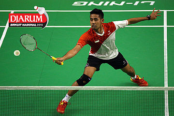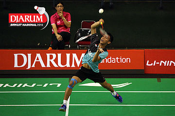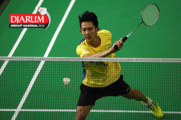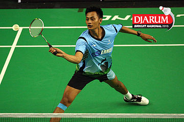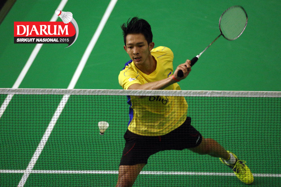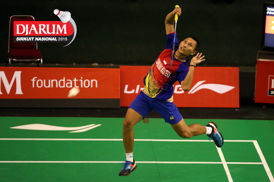 Sonny Dwi Kuncoro (Tjakrindo Masters) melepaskan serangan ke arah Alvindo Saputra (Tangkas).