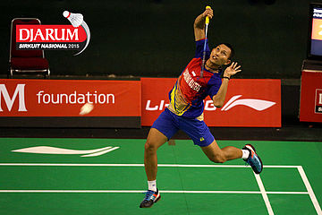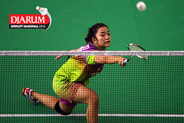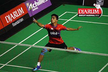M. Bayu Pangisthu (Pelatnas) menyambar pengembalian dari Setyaldi Putra (Guna Dharma).