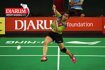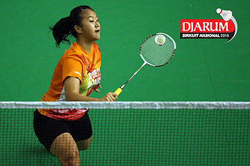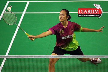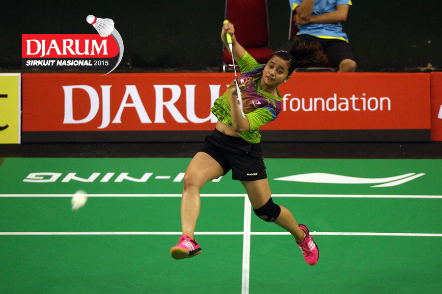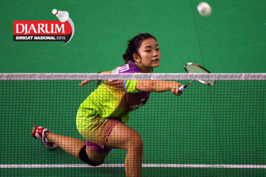 Rusydina Antardayu (Tangkas) mengembalikan shuttlecock ke arah Des Yeni (Guna Dharma).
