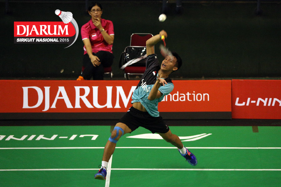 Krisna Adi (Pelatnas) melepaskan serangan ke arah Fikri Ihsandi (Tangkas).