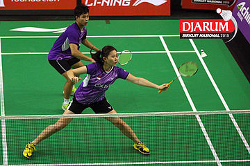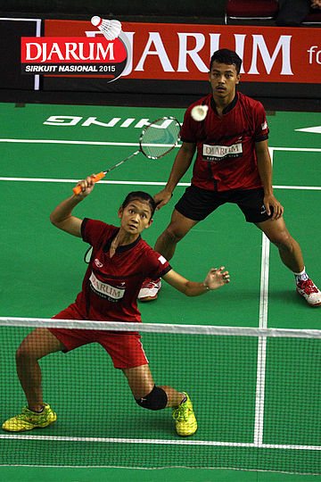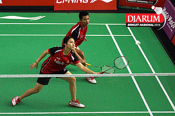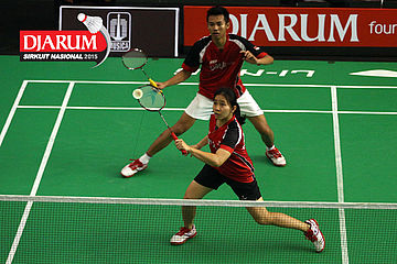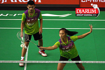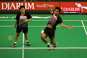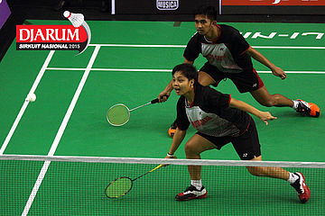 Fauzi Habibie/Apriani Rahayu (Pelita Bakrie) menyambar pengembalian dari M. Agung/Anita (Hi Qua Wima/Citra Raya Unesa).