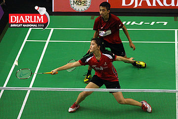 Yahya Adi/Ramadhani Hastiyanti (Djarum Kudus) bersiap menyambar pengembalian tanggung dari Billy Jonathan/Marissa Vania (Candra Wijaya/Tangkas).