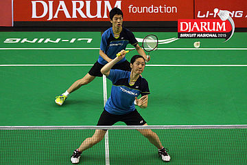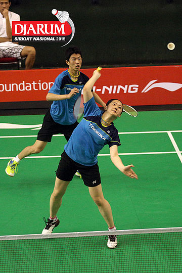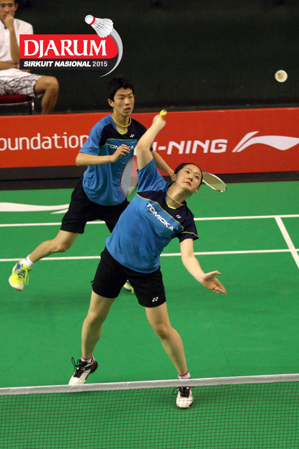 Taiki Honda/Haruka Nidaira (Tomioka Jepang) bersiap menyambar pengembalian tanggung dari Akbar Gusti/Serena Kani (Djarum Kudus).