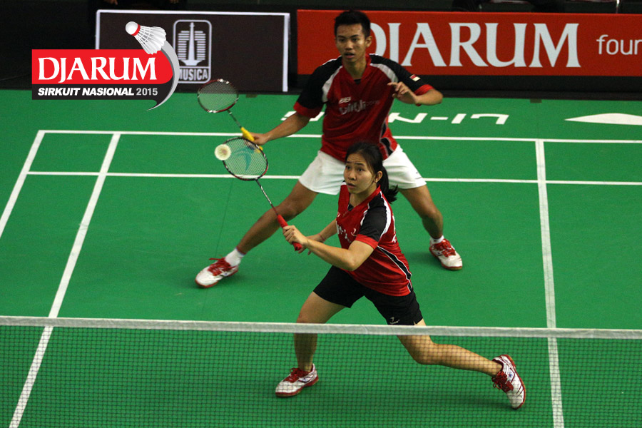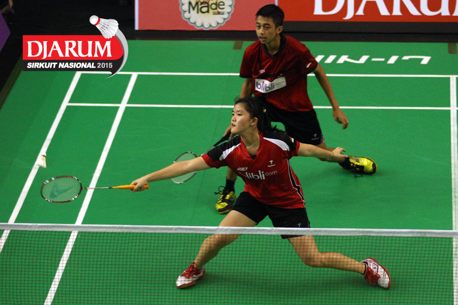 Andika Ramadiansyah/Mychelle Crhystine (Djarum Kudus) mengembalikan shuttlecock ke arah Jericho See/Syahara Putri (SKO Ragunan).