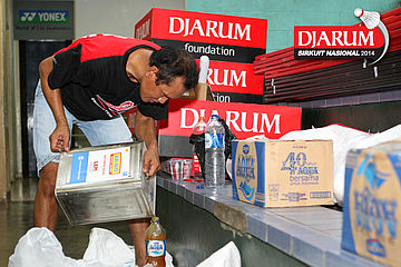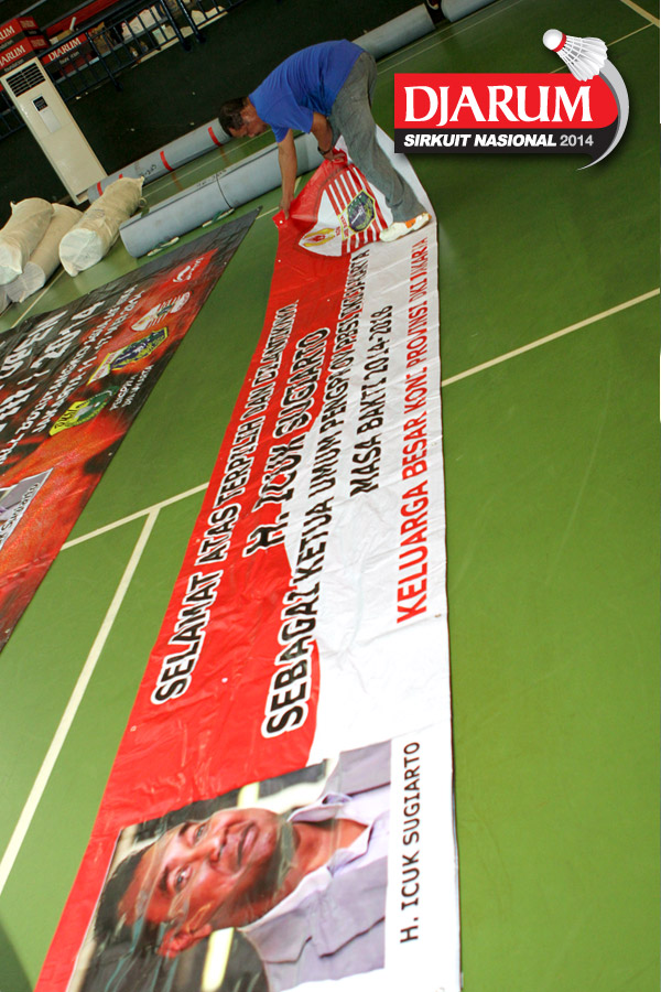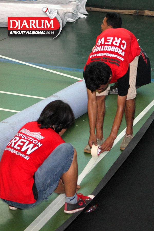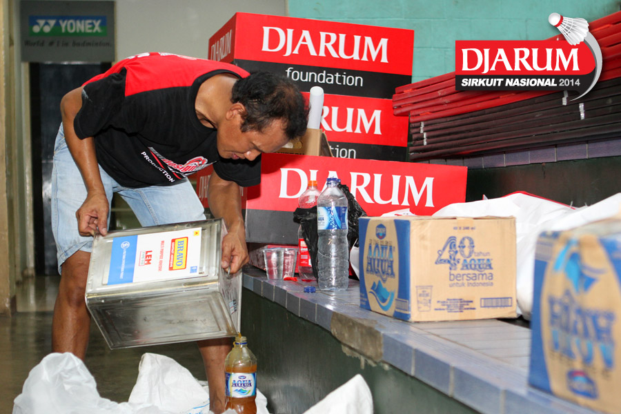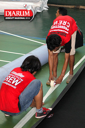 Seorang pekerja saat menuangkan cairan perekat untuk keperluan dekorasi pelaksanaan Djarum Sirkuit Nasional Li-Ning Jakarta Open 2014 di GOR Asia Afrika, Jakarta