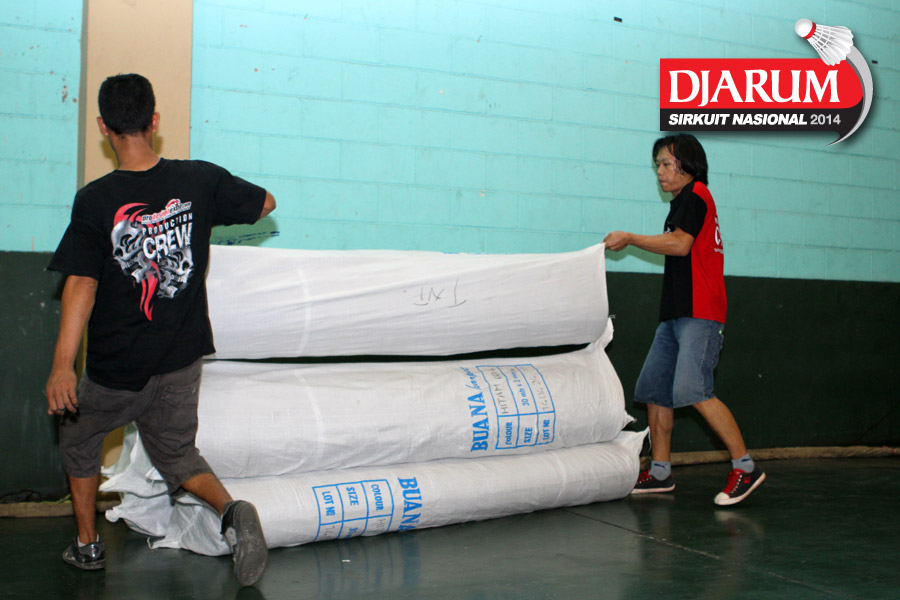 Dua pekerja saat membuka gulungan karpet pertandingan
