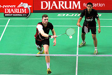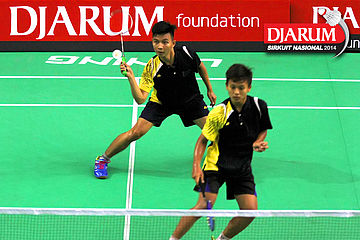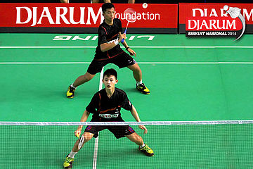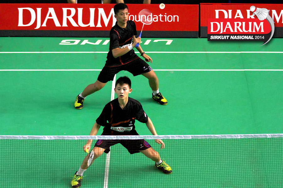 Ghiyats Afif/Stefanus Christian (PB Djarum) bersiap menghadang pengembalian dari M. Agus/Ricardo P. Liu (Exist)