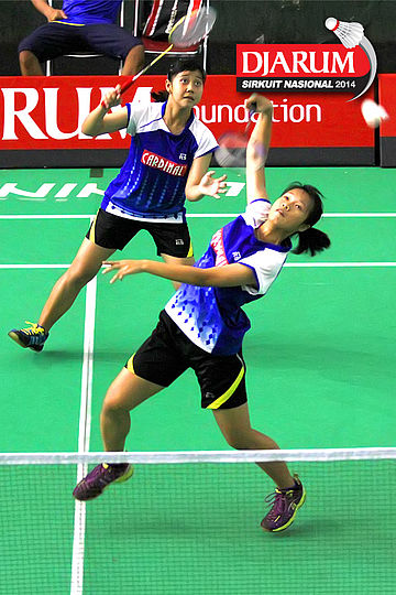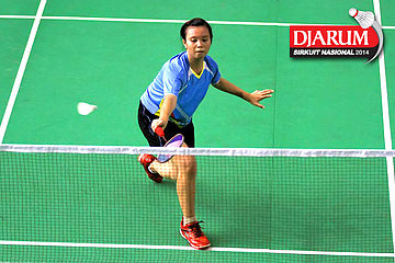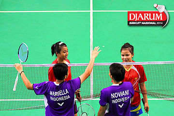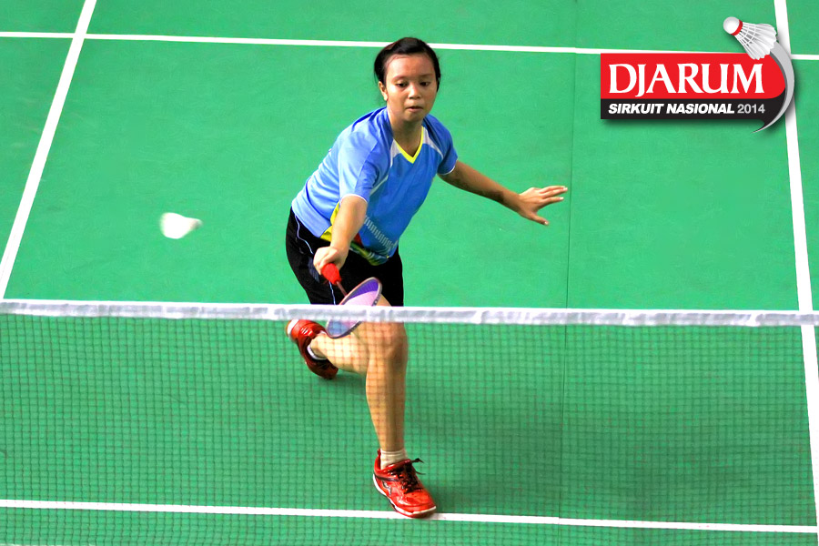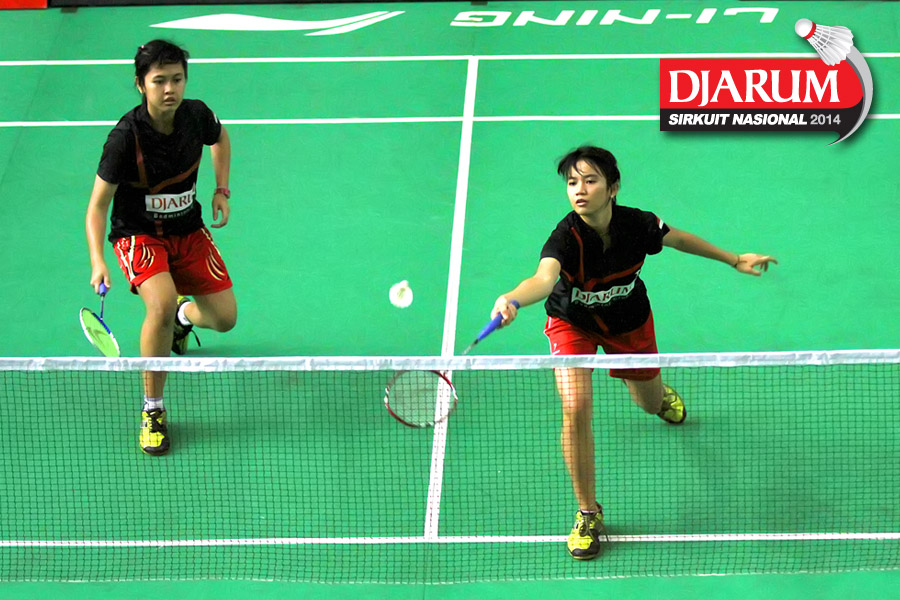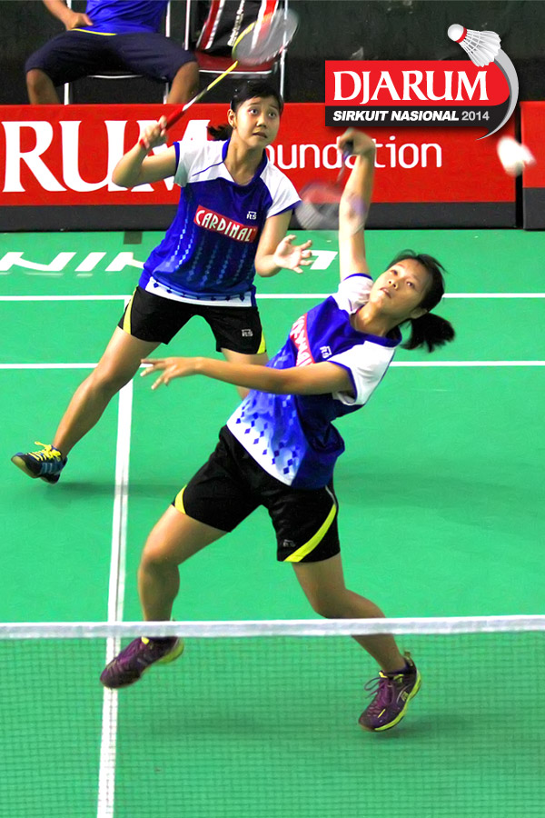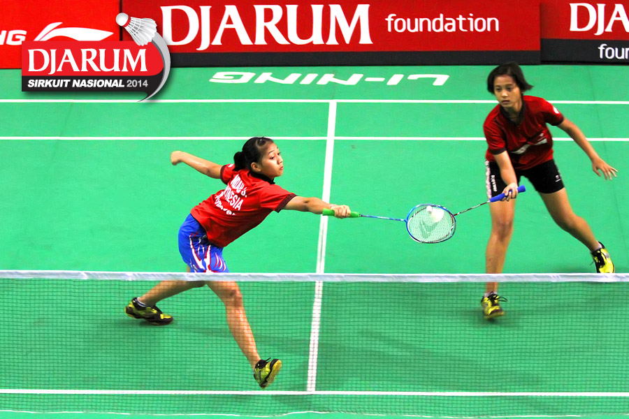 Atika Sita/Indah Cahya Sari (PB Djarum) menghadang serangan yang dilepaskan pasangan Salma Nuha/Syarifah (PPLP DKI Jakarta)