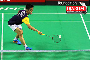 Jonatan Christie (Pelatnas) bersiap menyambar pengembalian tanggung dari Alvindo Saputra (Tangkas)