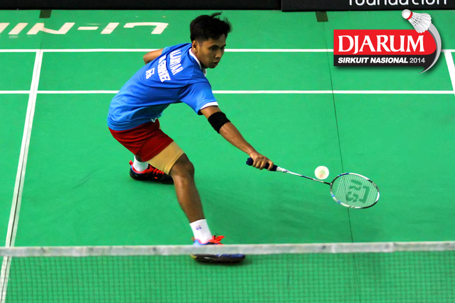 Alamsyah Yunus (JR Enkei) mengembalikan shuttlecock ke arah Rifan Fauzin (Pelatnas).