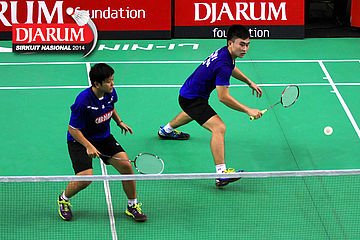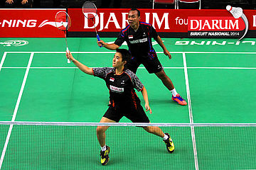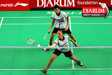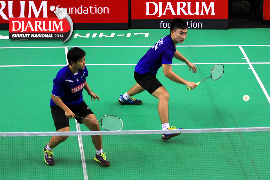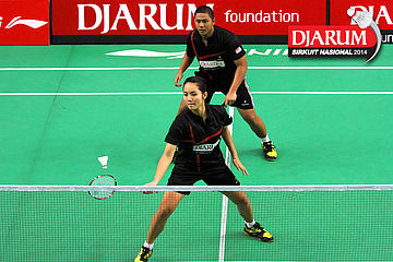 Reinard Dhanriano/Nisak Puji (Mutiara Bandung) bersiap menyambut pengembalian dari Yantoni Edi/Marsheilla Gischa (PB Djarum)