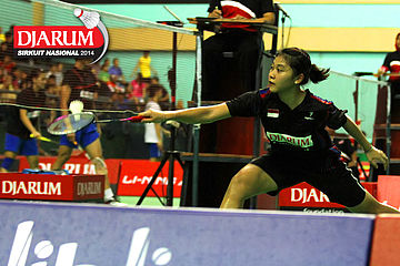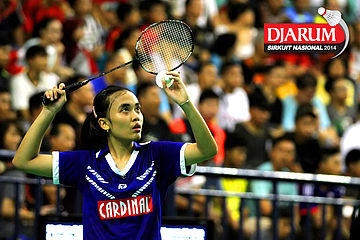 Marsa Indah (PB Djarum) mengembalikan shuttlecock ke arah Linda Mutiara (Mutiara Bandung)