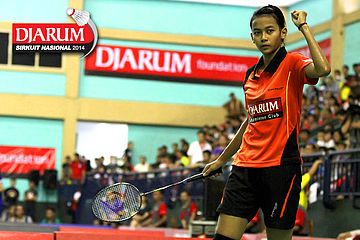 Ekspresi Dinar Dyah Ayustine (PB Djarum) saat berhasil mencuri poin dari Elizabeth Purwaningtyas (SGS PLN)