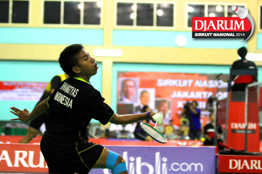 Rinov Rivaldy/Vania Arianti (PB Djarum) mengembalikan shuttlecock ke arah M. Reiza/Zarra Faza (Jaya Raya)