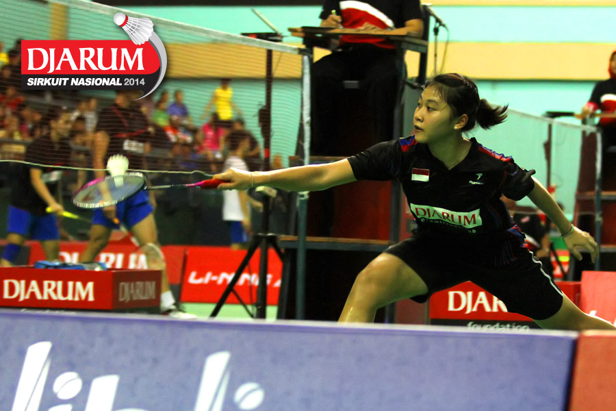 Elizabeth Purwaningtyas (SGS PLN) mengembalikan shuttlecock ke arah Dinar Dyah Ayustine (PB Djarum)