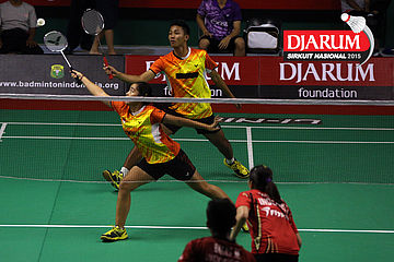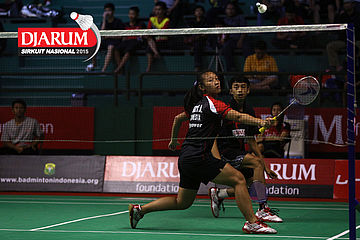 Moehamat Febriansyah/Rofahadah SUpriadi (Djarum Kudus) menghadang serangan.