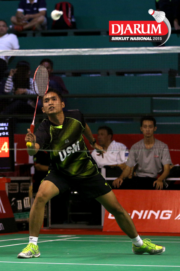 Bandar Sigit (USM) mengembalikan shuttlecock.