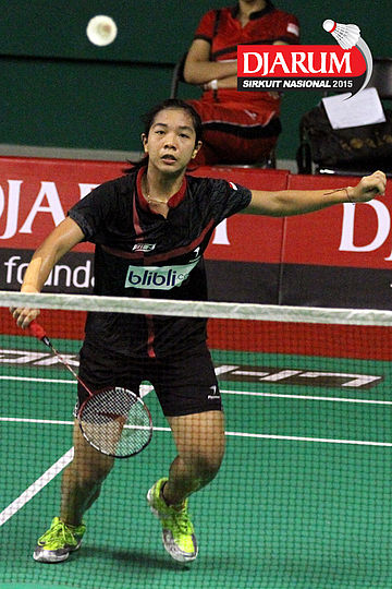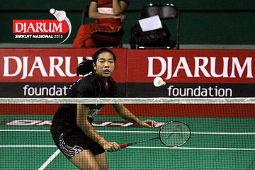 Ayu Gary (Djarum Kudus) bersiap menyambut shuttlecock.