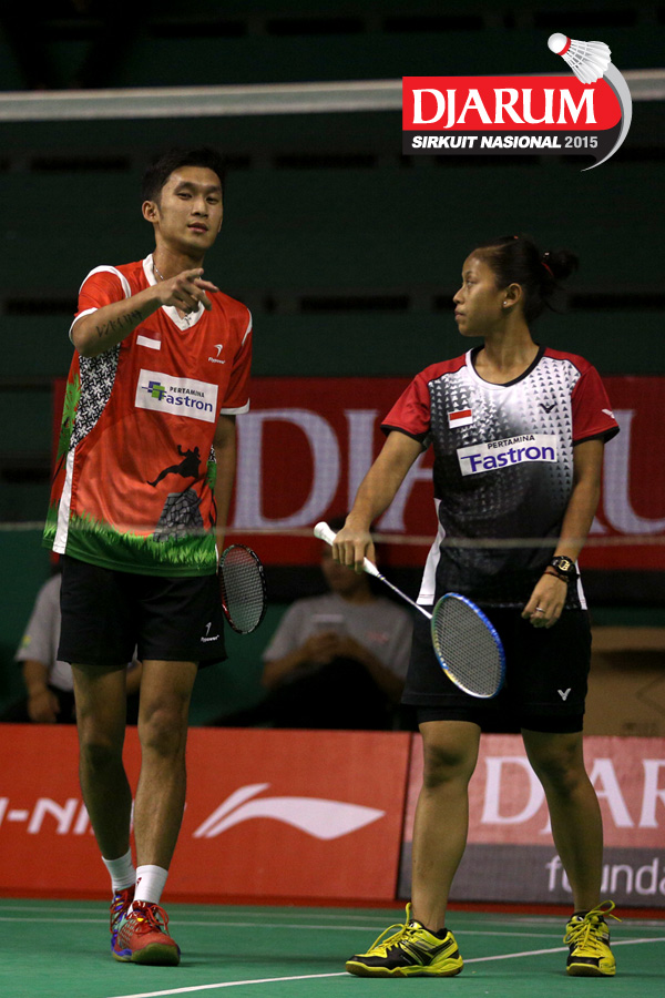 Yohanes Rendy dan Dian Fitriani (Pertamina Fastron) saling berkoordinasi.
