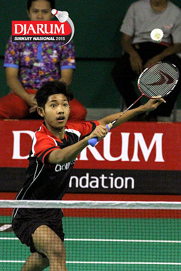 Bagas Kristianto (Djarum Kudus) bersiap menyambar pengembalian.
