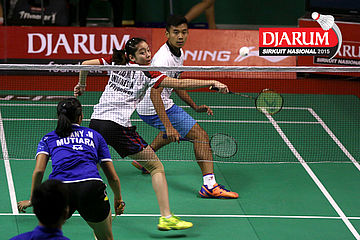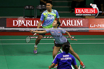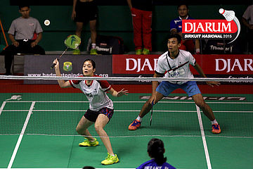 Panji Akbar/Apriyani Rahayu (Pelita Bakrie) melepaskan serangan.
